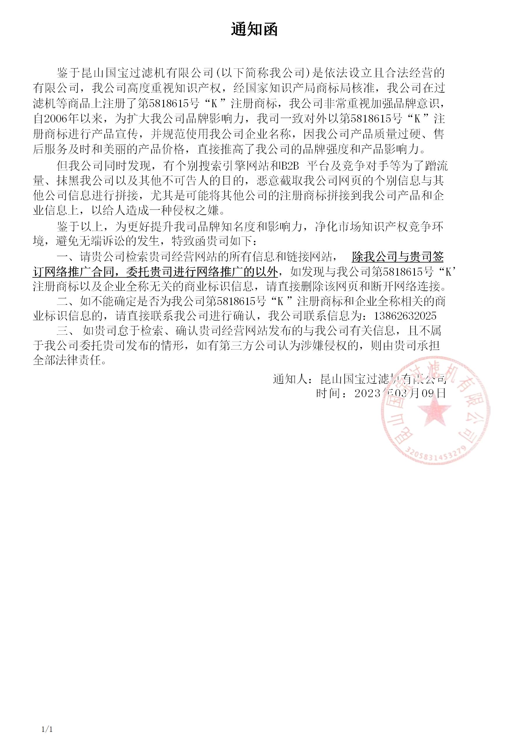 一、我公司合法使用的商標是第5818615號“K”注冊商標,我公司的企業(yè)全稱是昆山國寶過濾機有限公司,我公司對外推廣宣傳僅使用的是我公司第5818615號“K”注冊商標和企業(yè)全稱進行,故市場所有出現(xiàn)的其他商標標識的行為均不是我公司所為,與我公司無關。